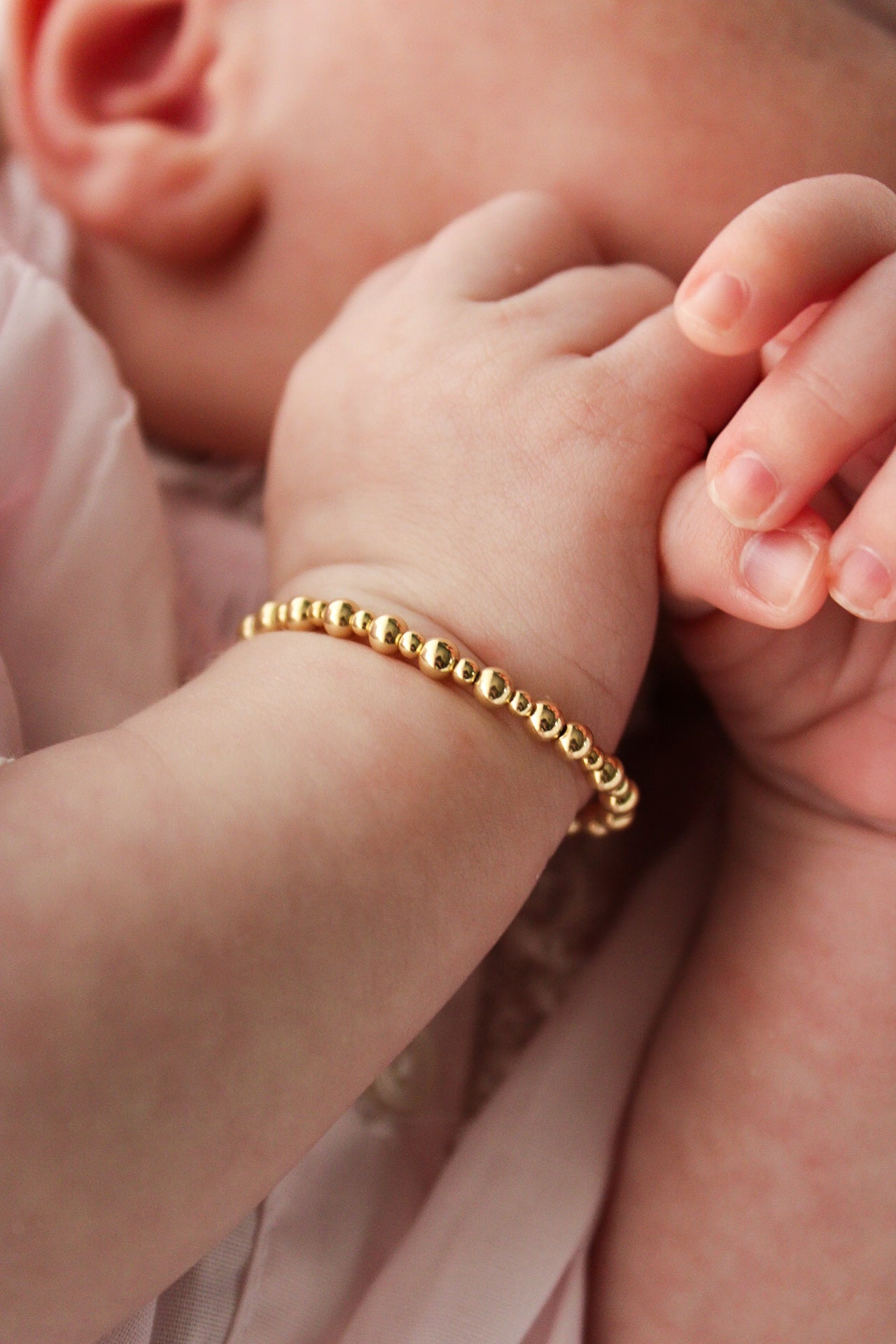 Hand-strung bracelets, made to fit even the tiniest wrist! These bracelets are the perfect addition to any outfit for every little girl! Made with gold filled components, this baby bracelet will look beautiful for years to come. Each bracelet has a small extender chain to allow it to grow with your child. Durable enough for play, precious enough to keep forever.